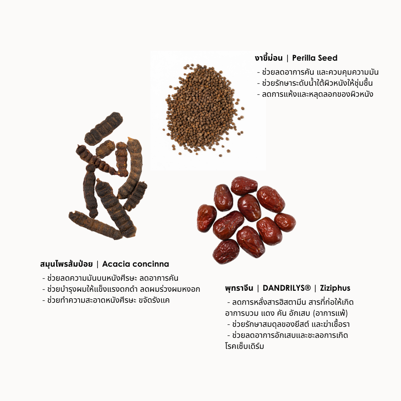 ปรับสมดุลหนังศีรษะ ลดอาการคัน และควบคุมความมัน รักษาระดับน้ำใต้ผิวหนังให้ชุ่มชื้น เพื่อลดการแห้งและหลุดลอกของผิวหนัง