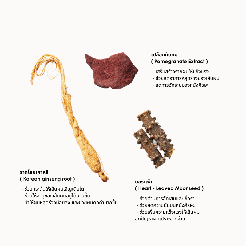 นอกจากเป็นยาอายุวัฒนะที่ล้ำค่าแล้ว รากโสมยังมีสรรพคุณที่ช่วยกระตุ้นให้เส้นผมเจิญเติบโต และบำรุงให้ผมแข็งแรง ทำให้ผมหลุดร่วงน้อยลง และช่วยผมดกดำมากขึ้น ชำระล้างสารพิษที่ตกค้างบนหนังศีรษะ และอุดตันในเซลล์รากผม ทำให้เลือดไหลเวียนไปหล่อเลี้ยงรากผมได้อย่างทั่วถึง